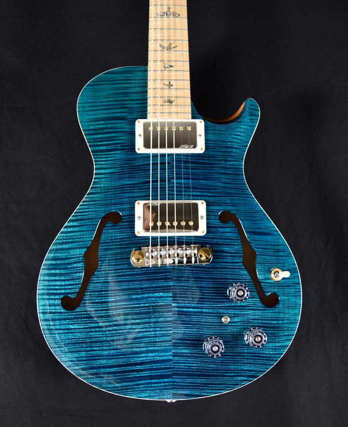 With this guitar, serial # 15 216705, we present to you one of our most stunning pieces. This is a custom ordered, Artist Package, Singlecut Hollowbody II in Azul blue, in new condition. There isn't a visible wood surface on this instrument that isn't highly figured maple, even inside the F-holes! The pattern carve neck is has retained its natural finish, which leaves is as smooth as a baby's bottom.
